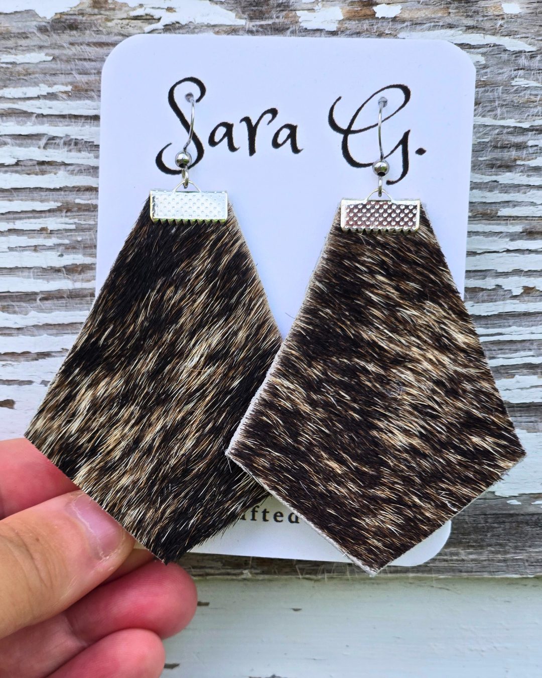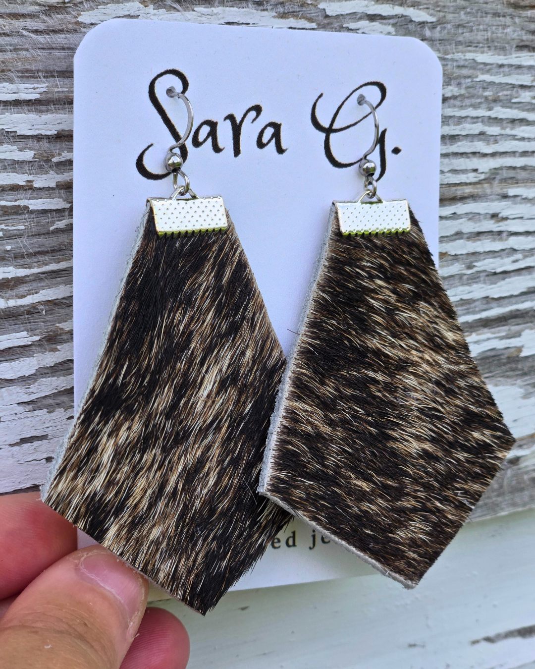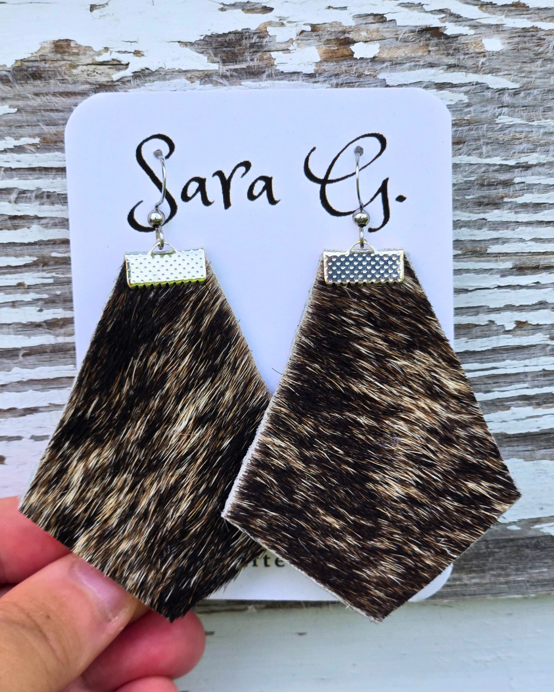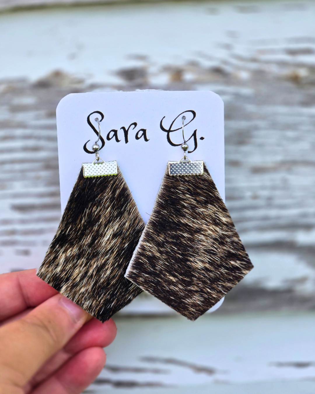 Add a bold and rustic flair to your outfit with these handcrafted cowhide diamond-shaped earrings by Sara G. Made from genuine cowhide leather, each pair features a unique natural pattern, ensuring no two are exactly alike. The soft fur texture and rich, earthy tones create an effortlessly Western vibe while remaining lightweight and comfortable for all-day wear.
