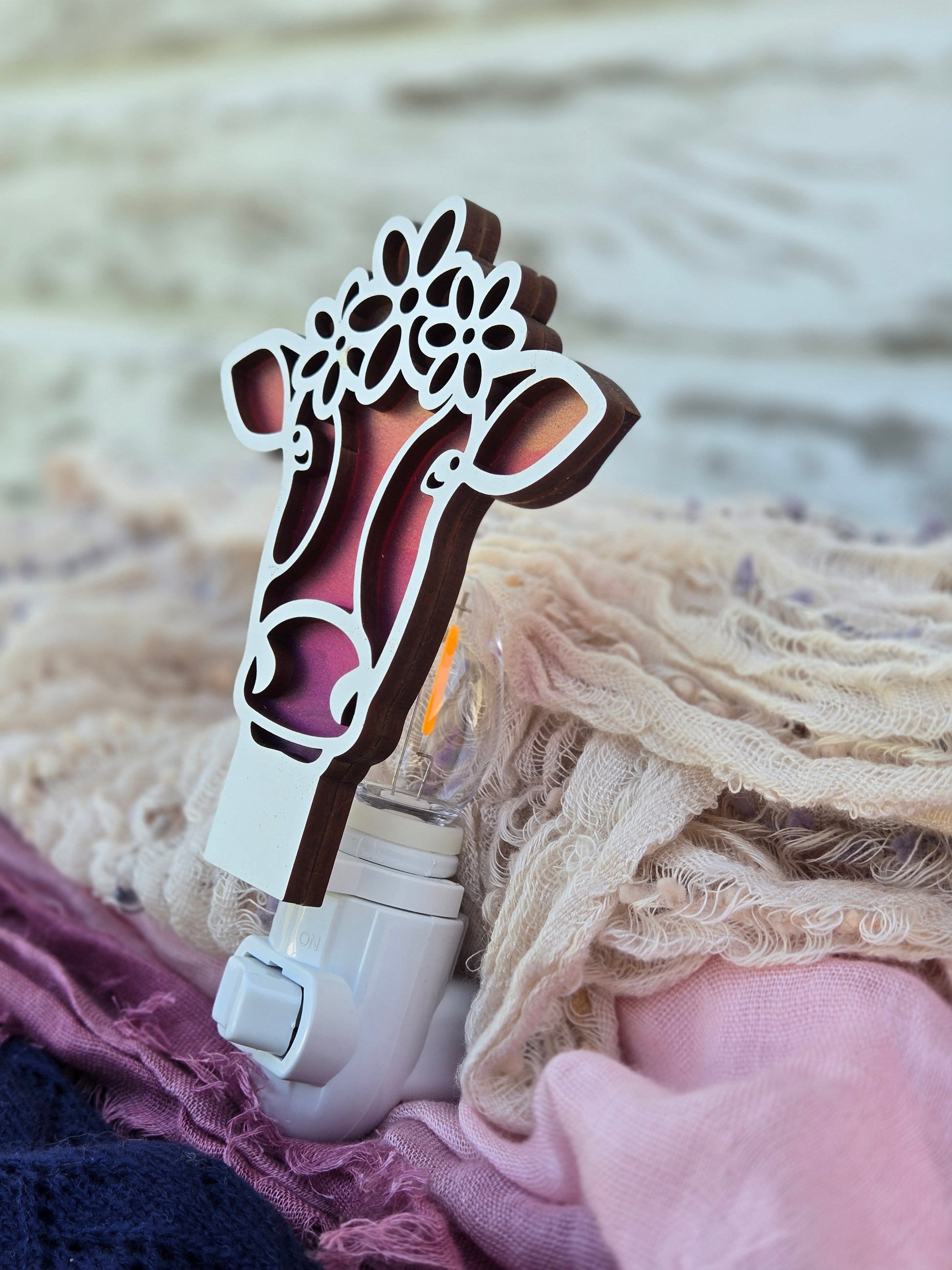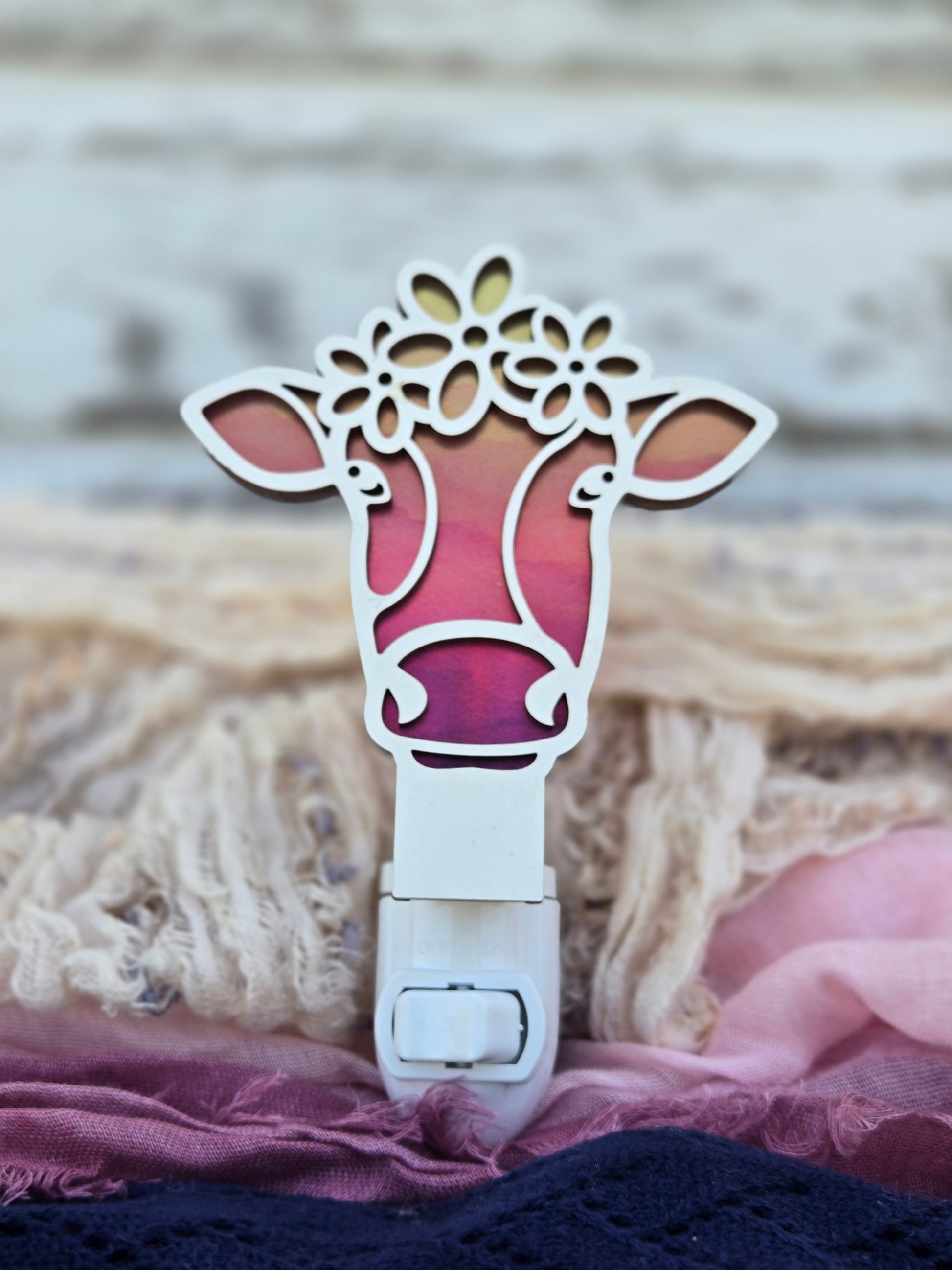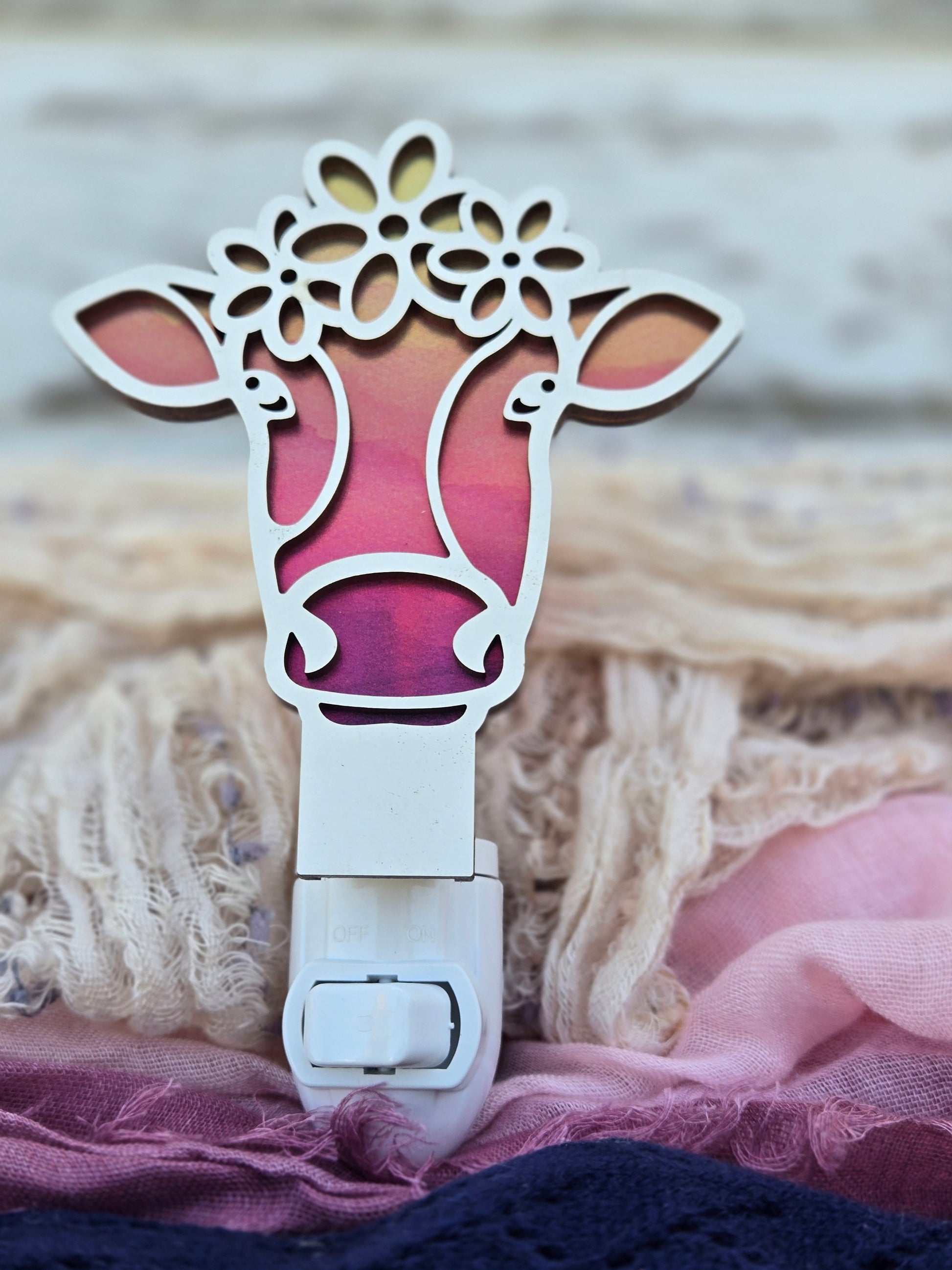 Add a touch of rustic charm and cozy warmth to your space with this Daisy Cow Night Light from Uniquely Yours by Shanda Gilbuena Benemerito. Handcrafted with care, this adorable night light features a laser-cut cow design topped with a daisy crown โ perfect for farmhouse lovers and anyone who adores a whimsical touch.