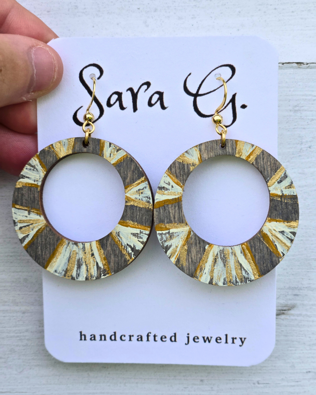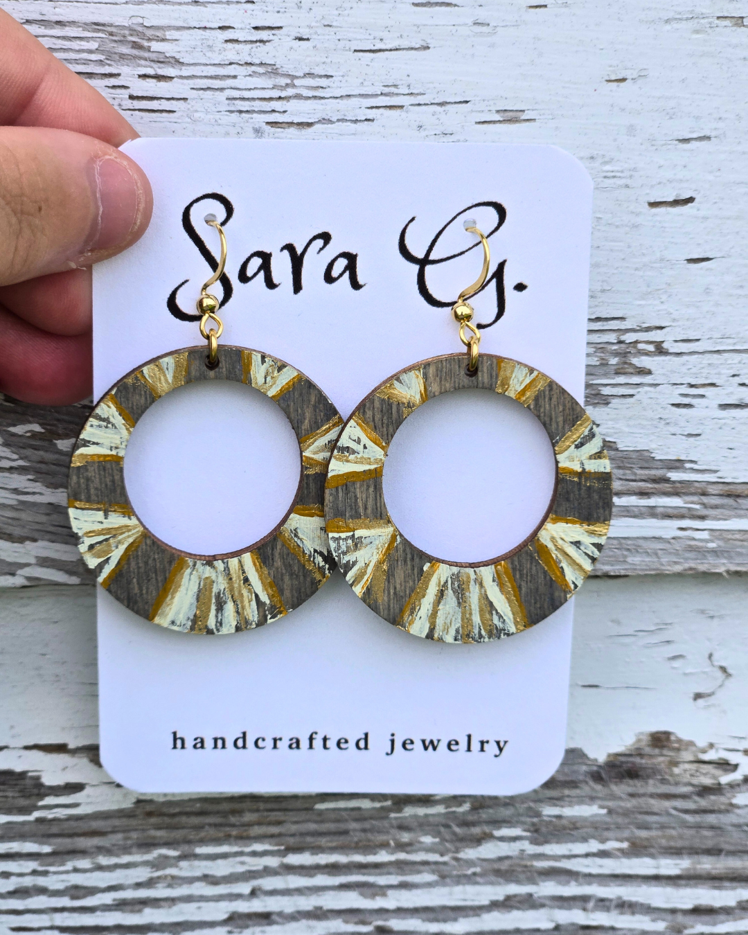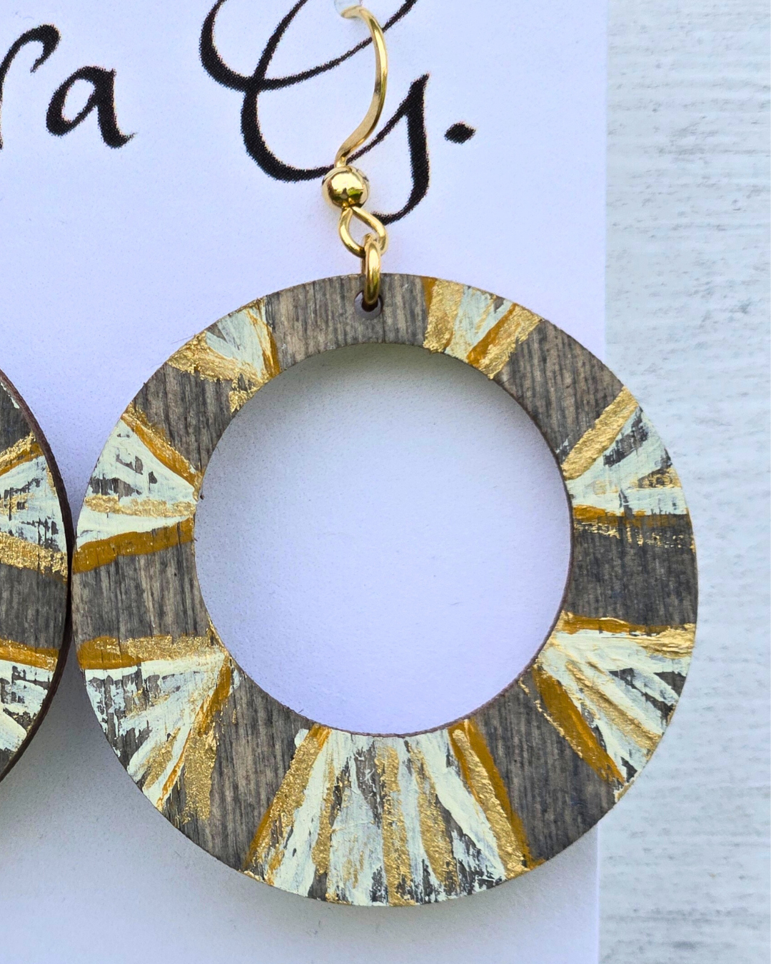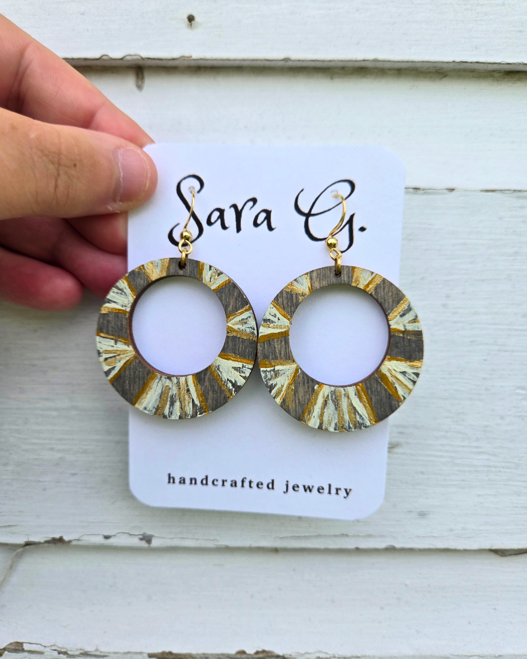 Add a splash of sunshine to your style with these stunning handcrafted wooden hoop earrings. Featuring hand-painted sunrise-inspired rays in soft ivory and gold over rich woodgrain, each pair is a wearable piece of art. Lightweight and eye-catching, they offer a perfect blend of rustic charm and bohemian elegance.