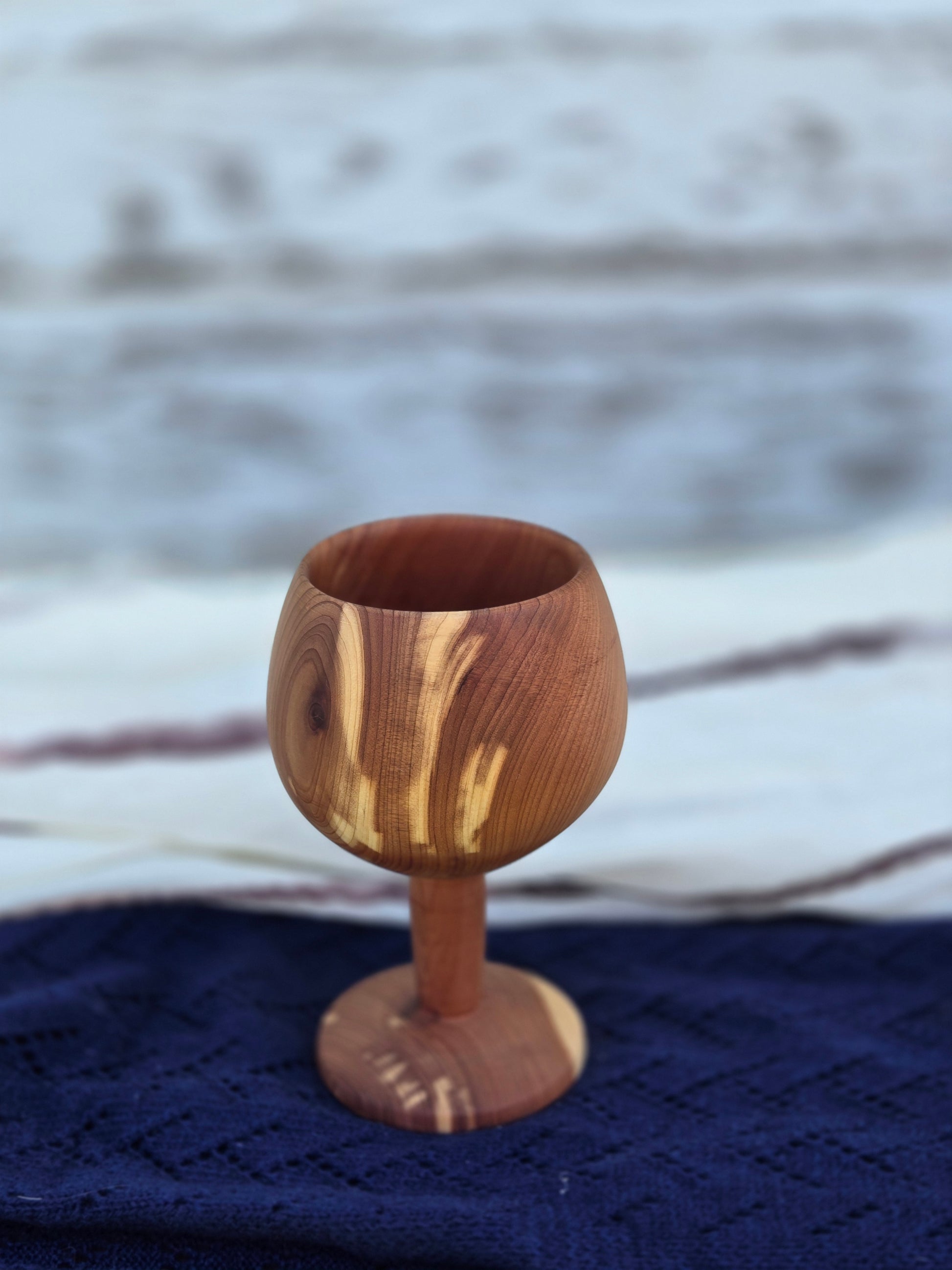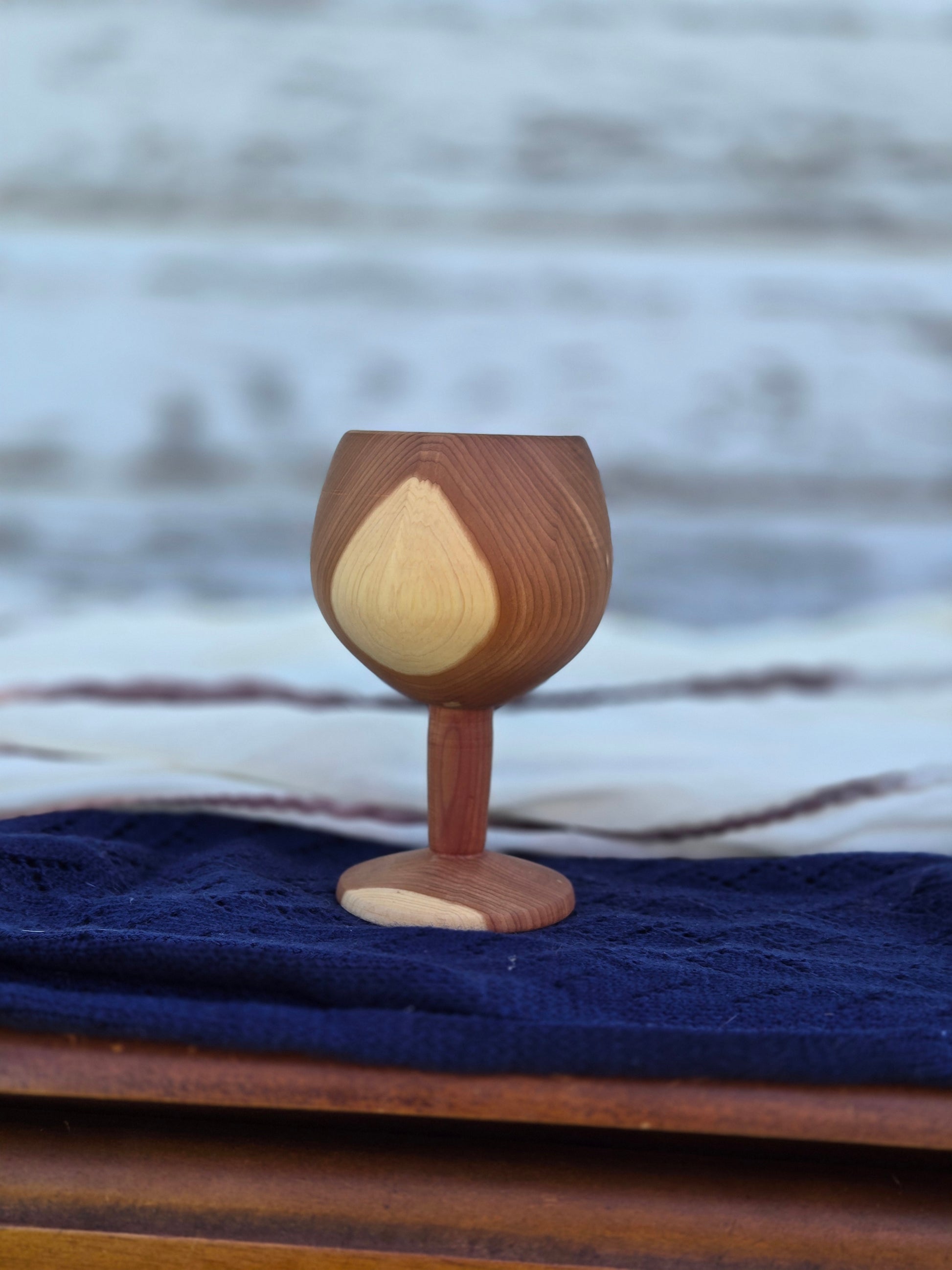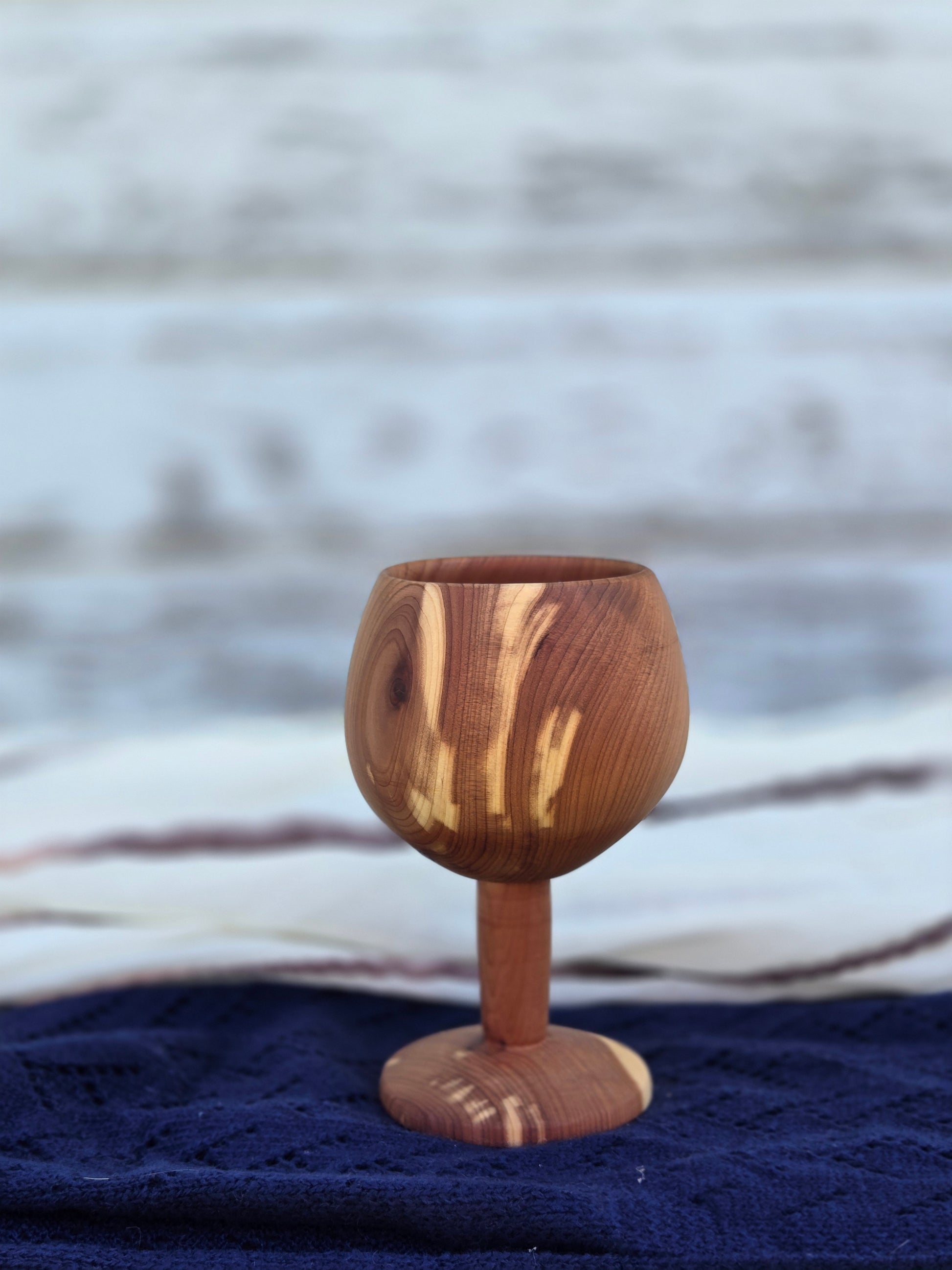 Enjoy a touch of rustic elegance with this large wooden wine glass, handcrafted by Papa Paul. Made from locally sourced cedar, the natural grain and warm tones create a striking, one-of-a-kind design that feels both earthy and refined.