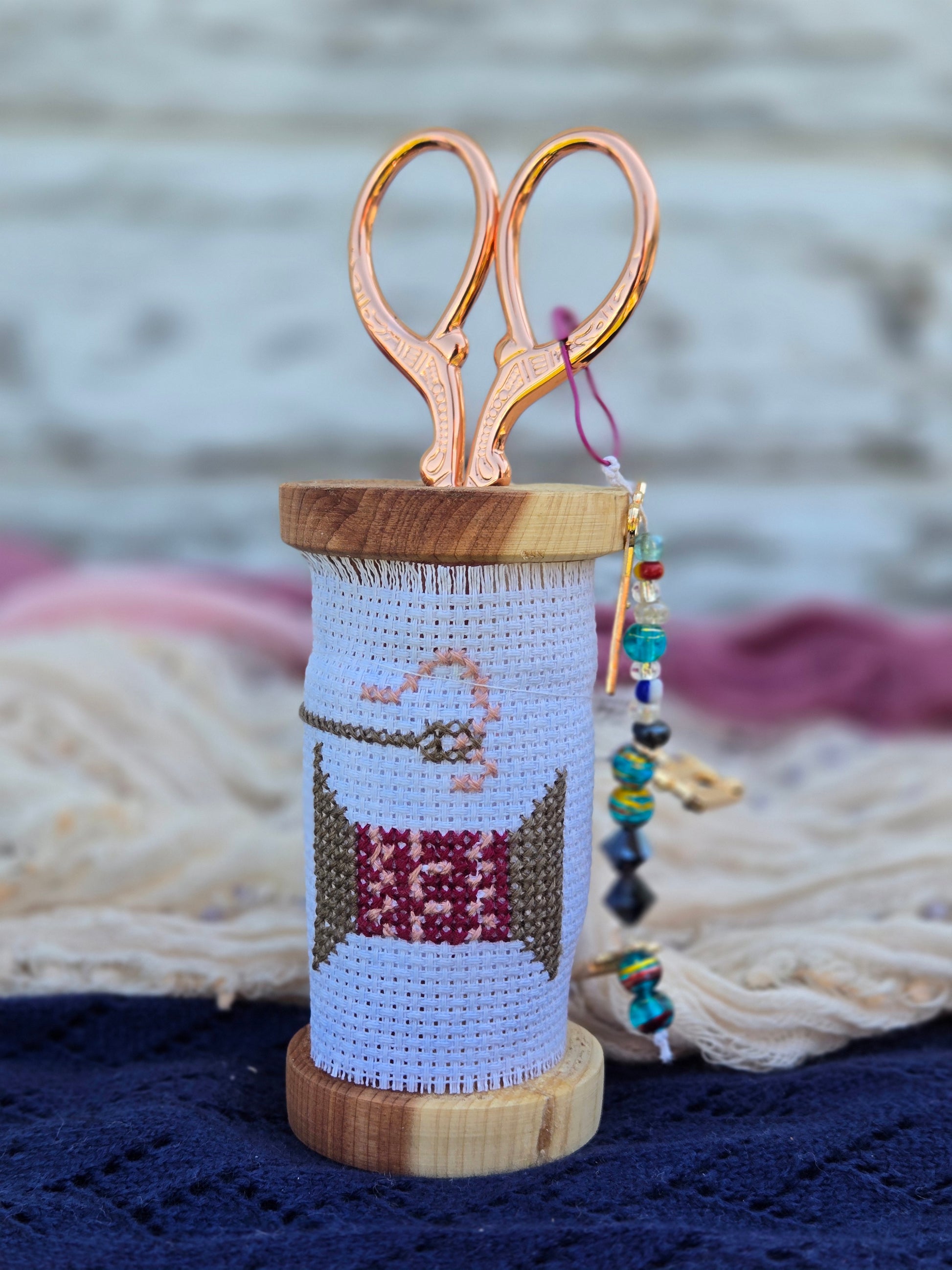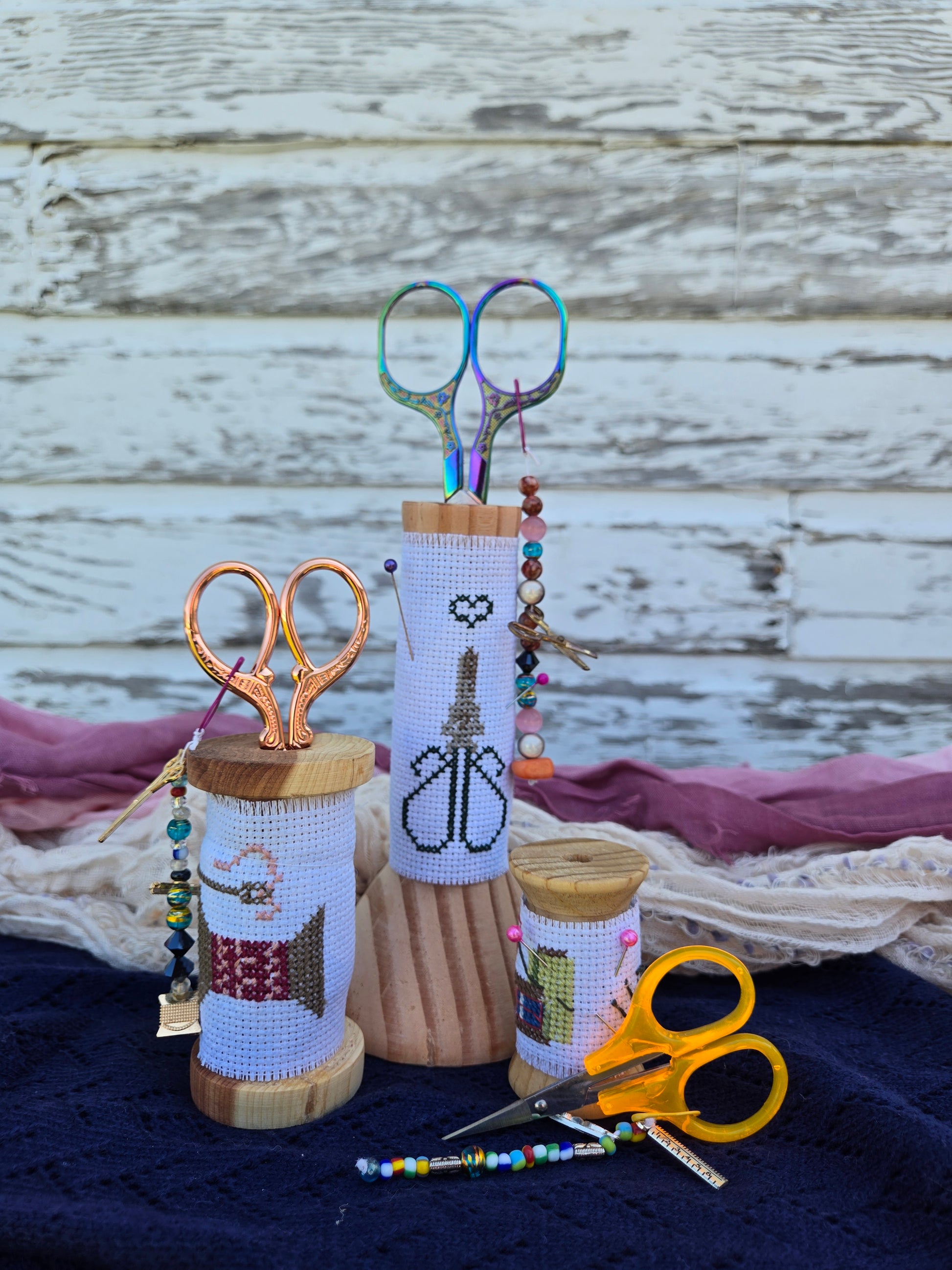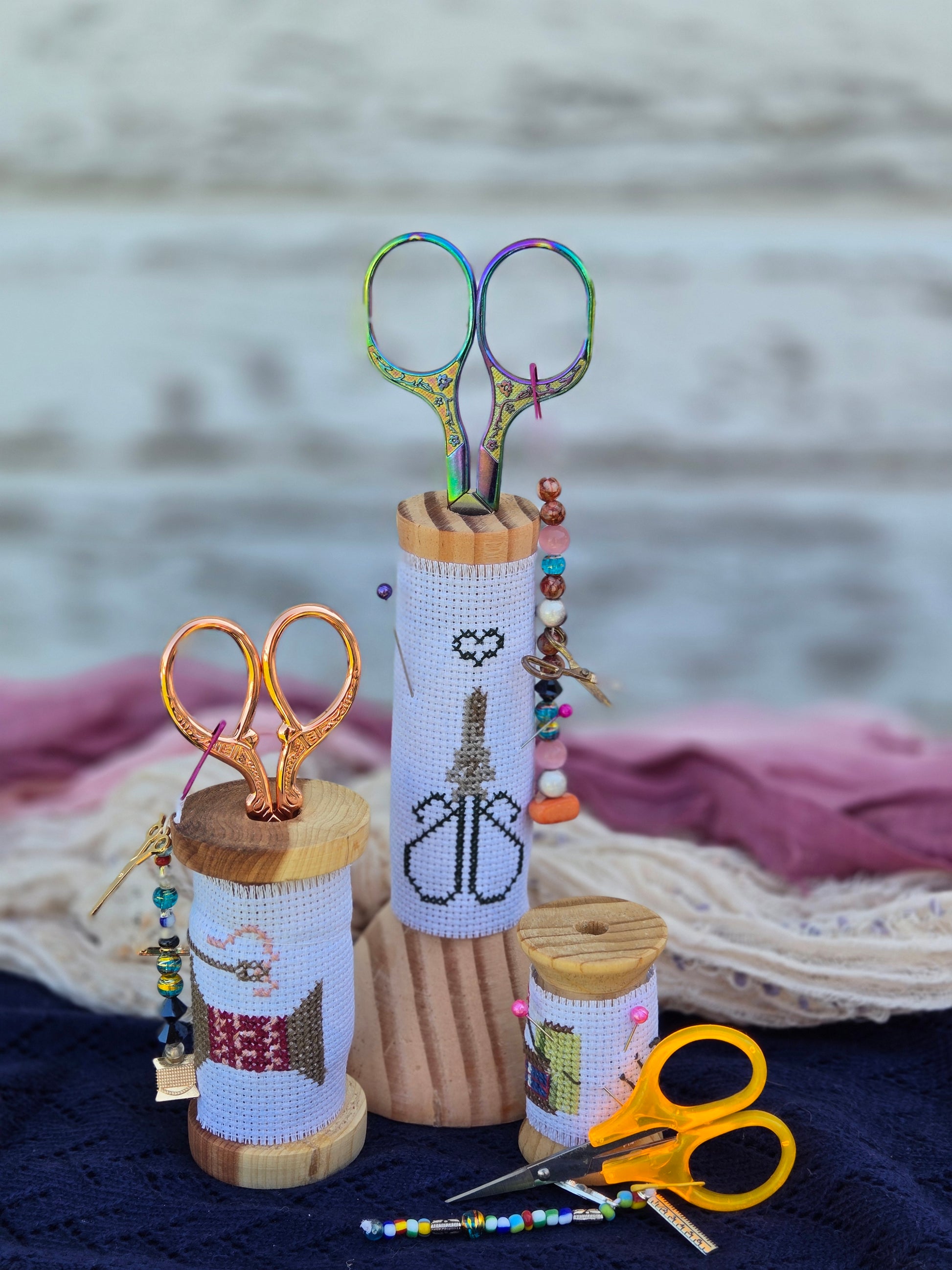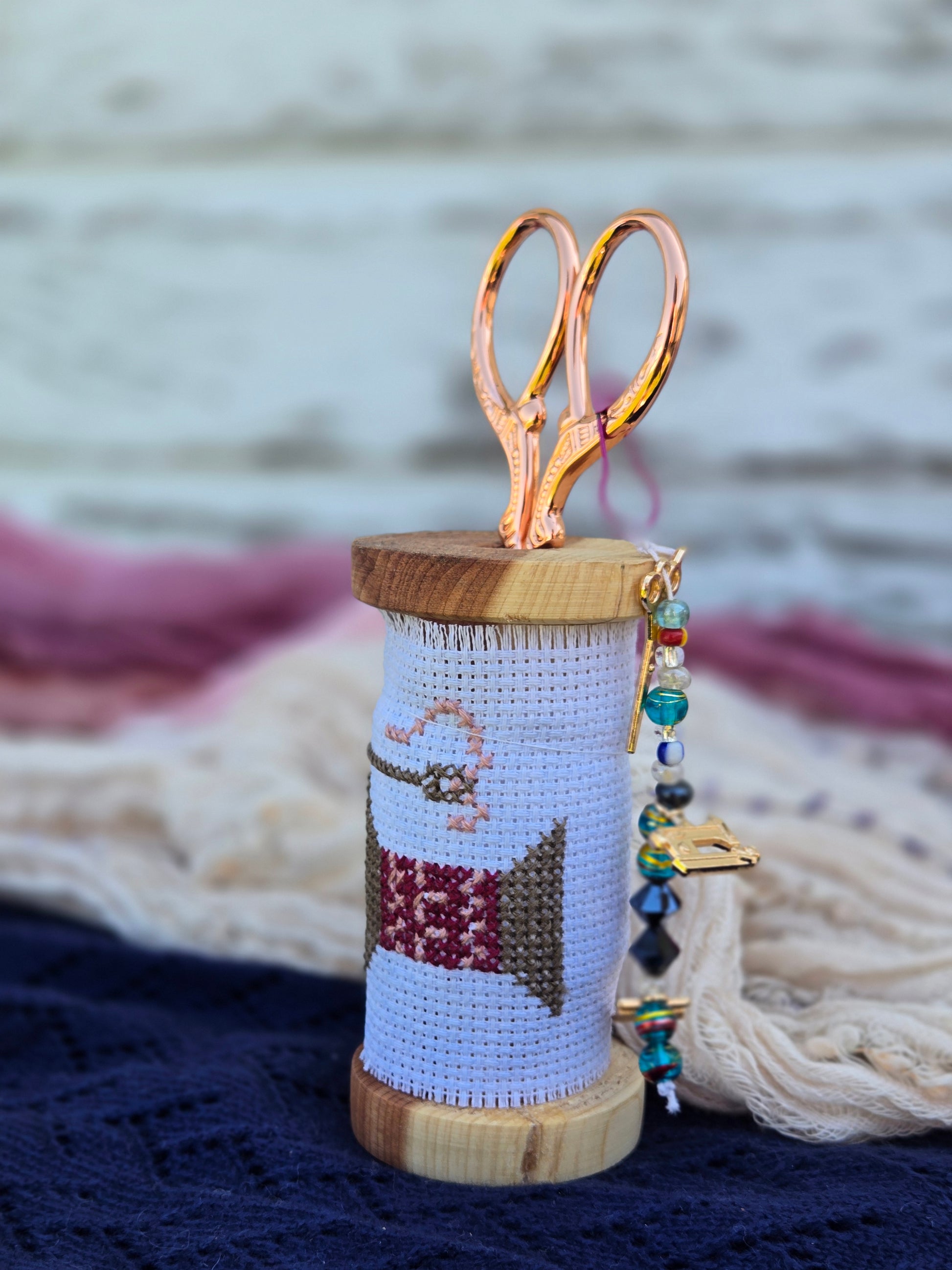 Keep your embroidery scissors neat and your crafting space charming with this mini wooden scissor stand. Hand-turned from natural wood and wrapped in a hand-stitched “spool of thread” cross-stitch design, this piece combines practical storage with delightful handmade artistry.