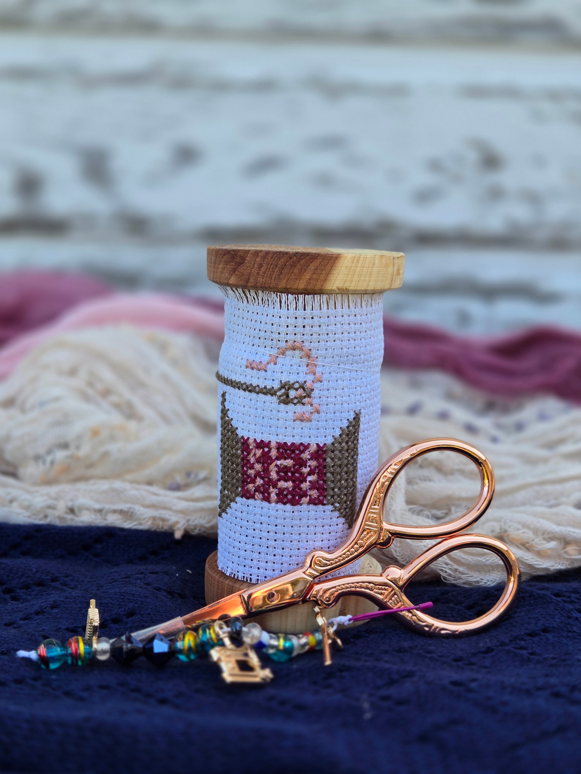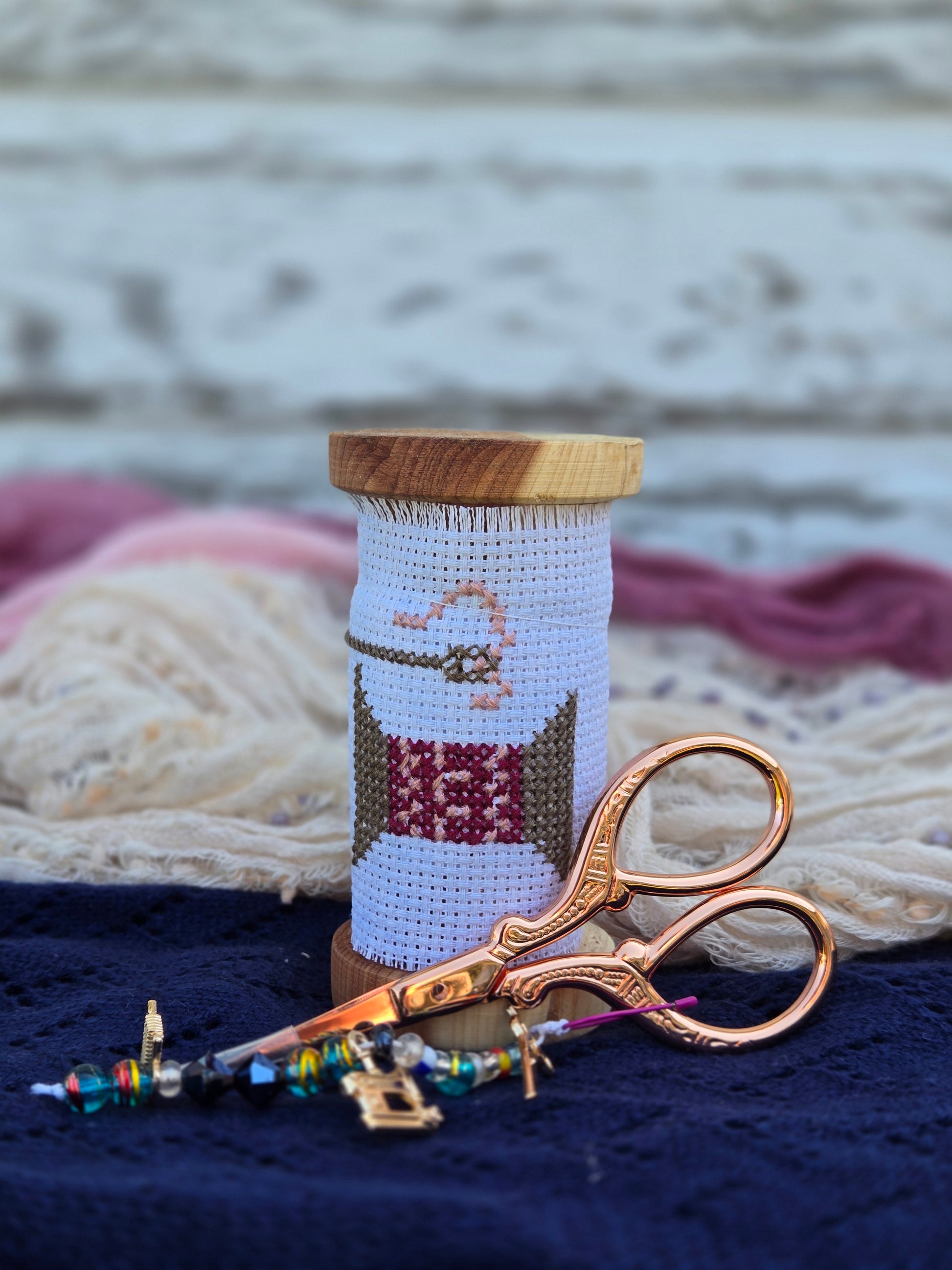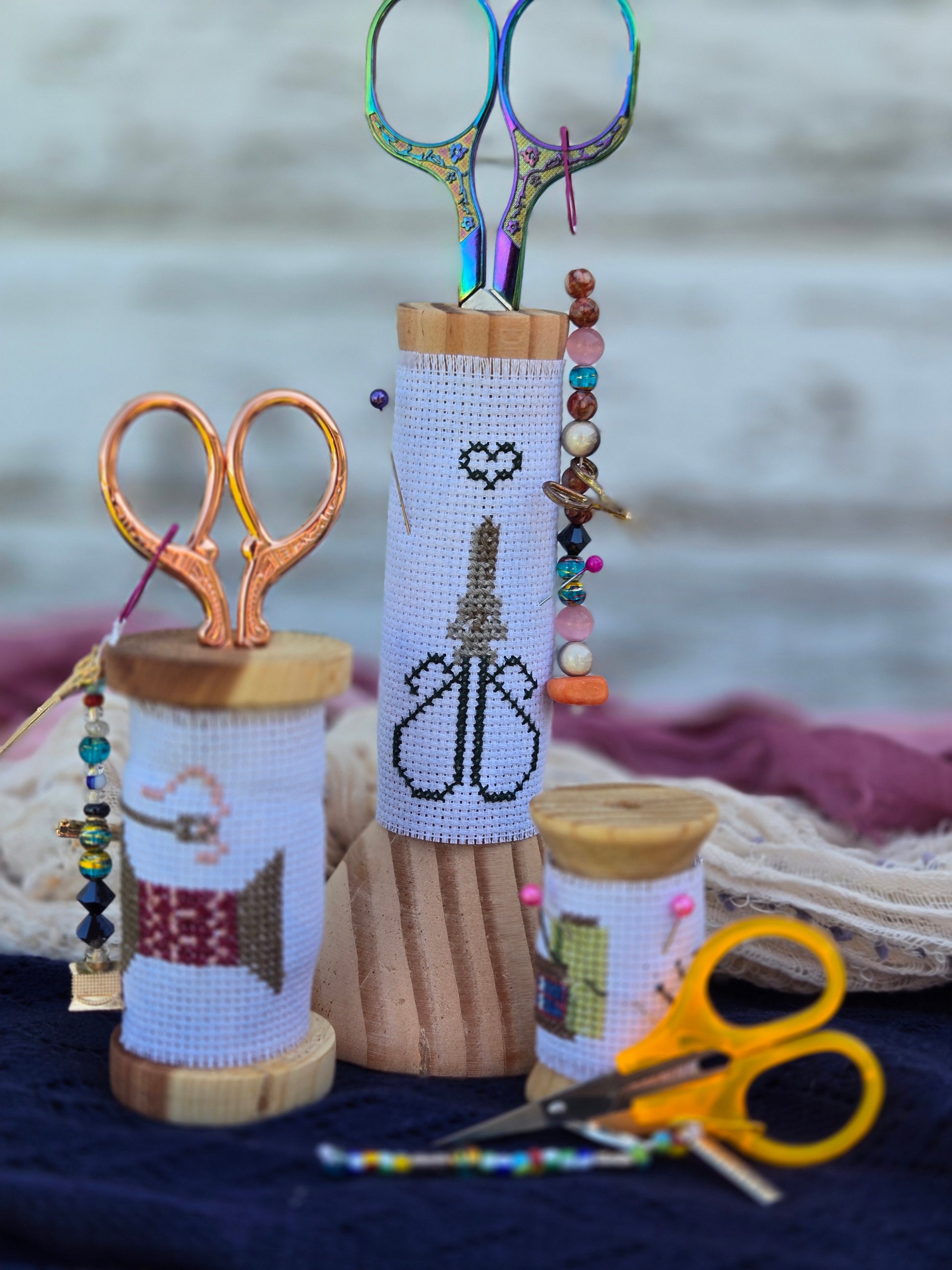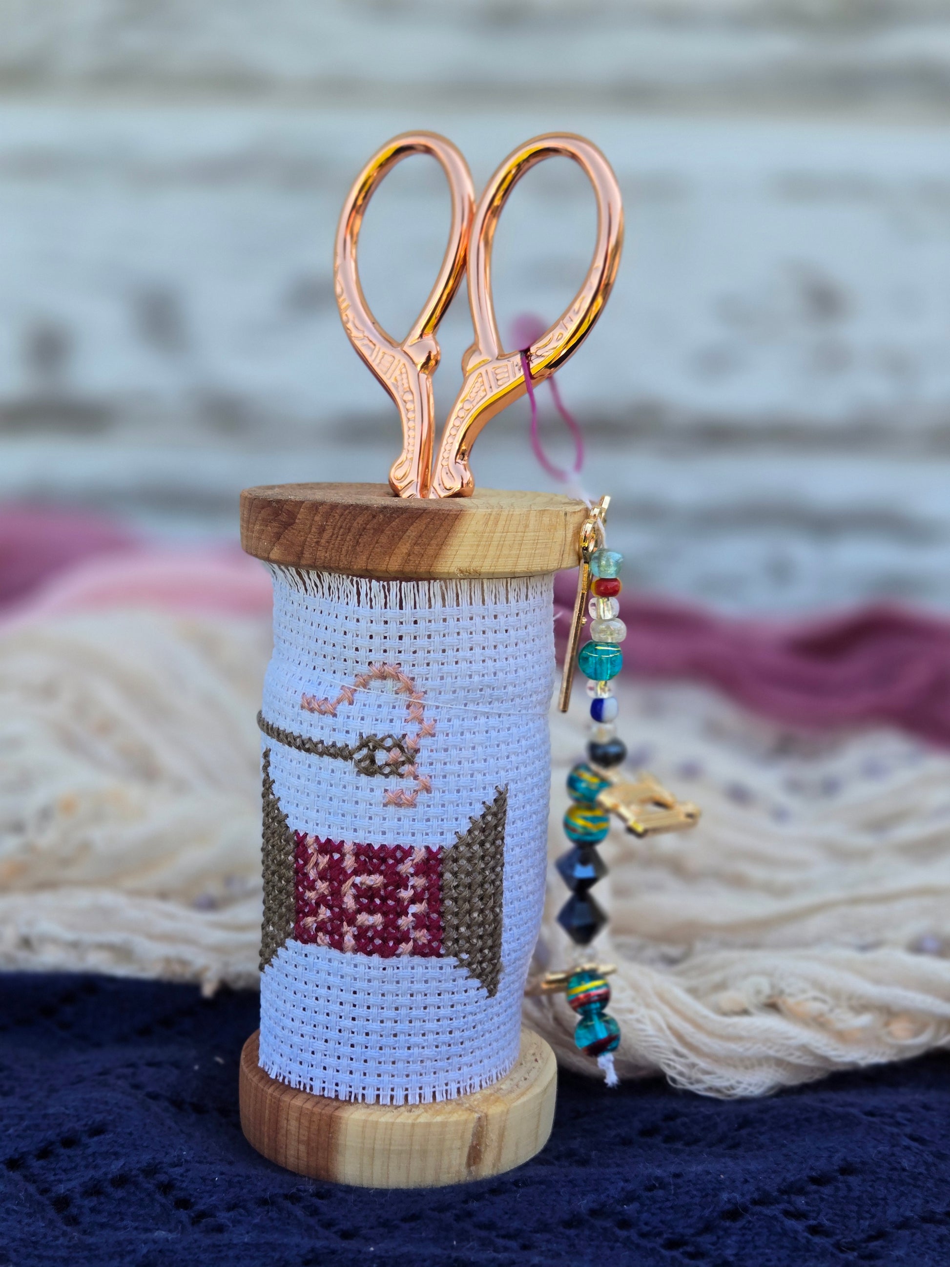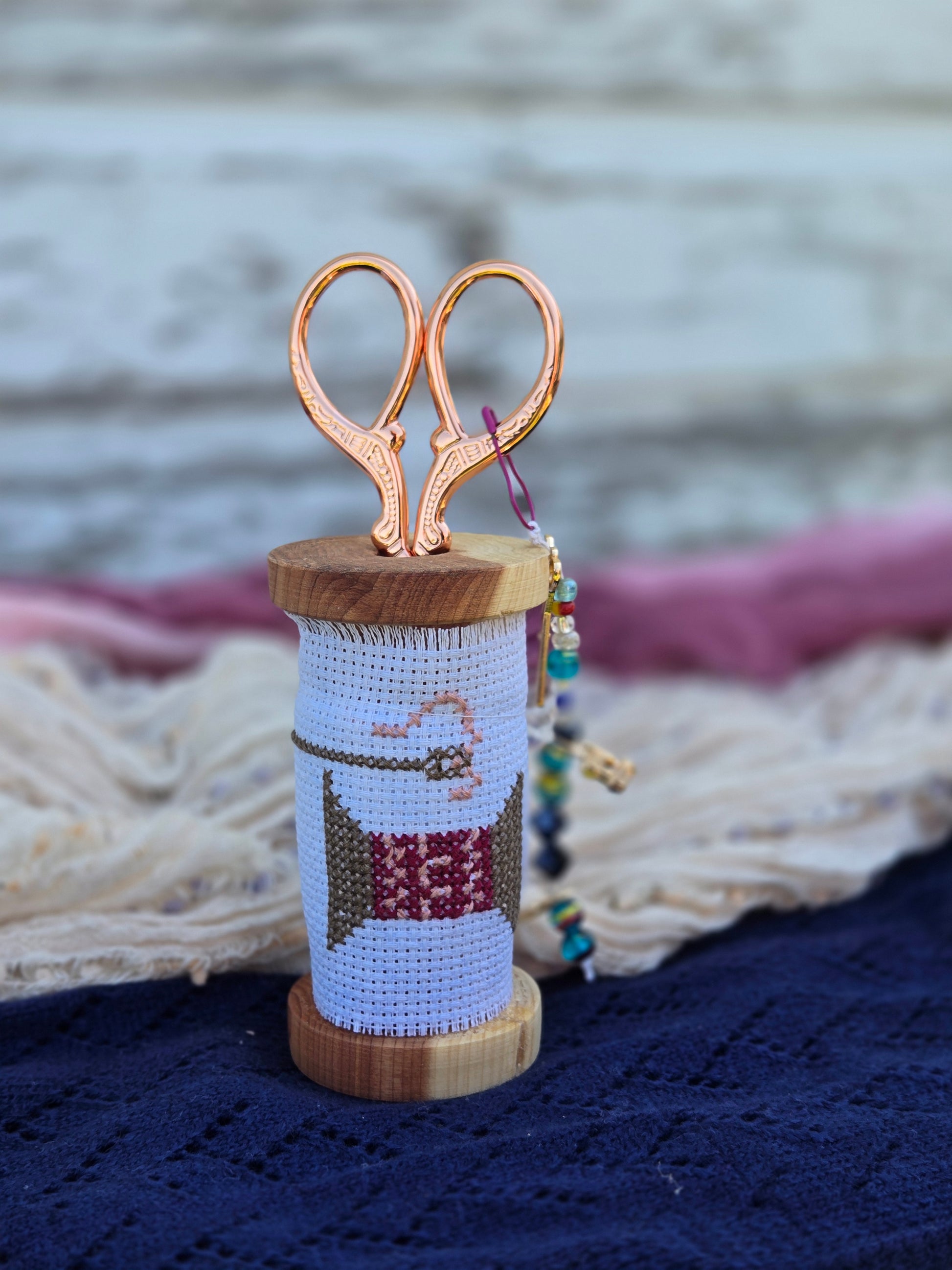 Keep your embroidery scissors neat and your crafting space charming with this mini wooden scissor stand. Hand-turned from natural wood and wrapped in a hand-stitched “spool of thread” cross-stitch design, this piece combines practical storage with delightful handmade artistry.