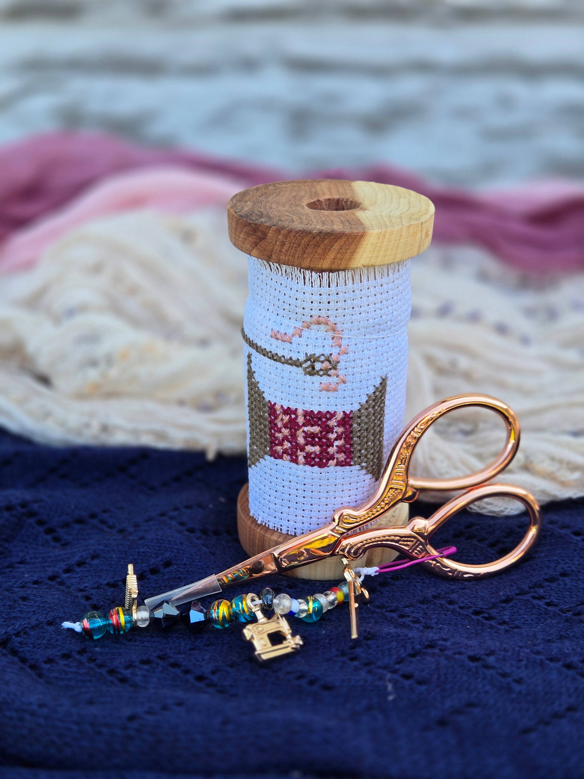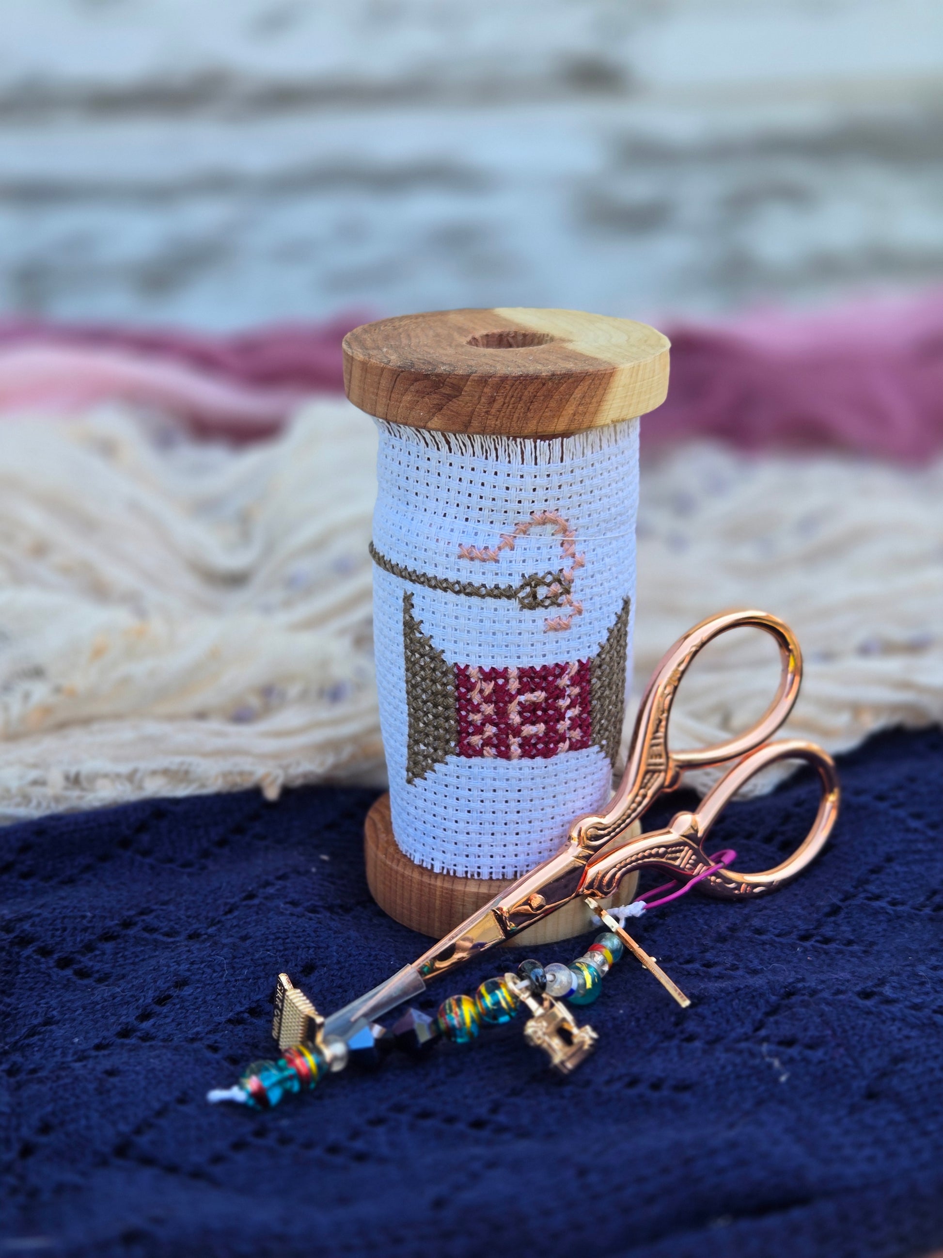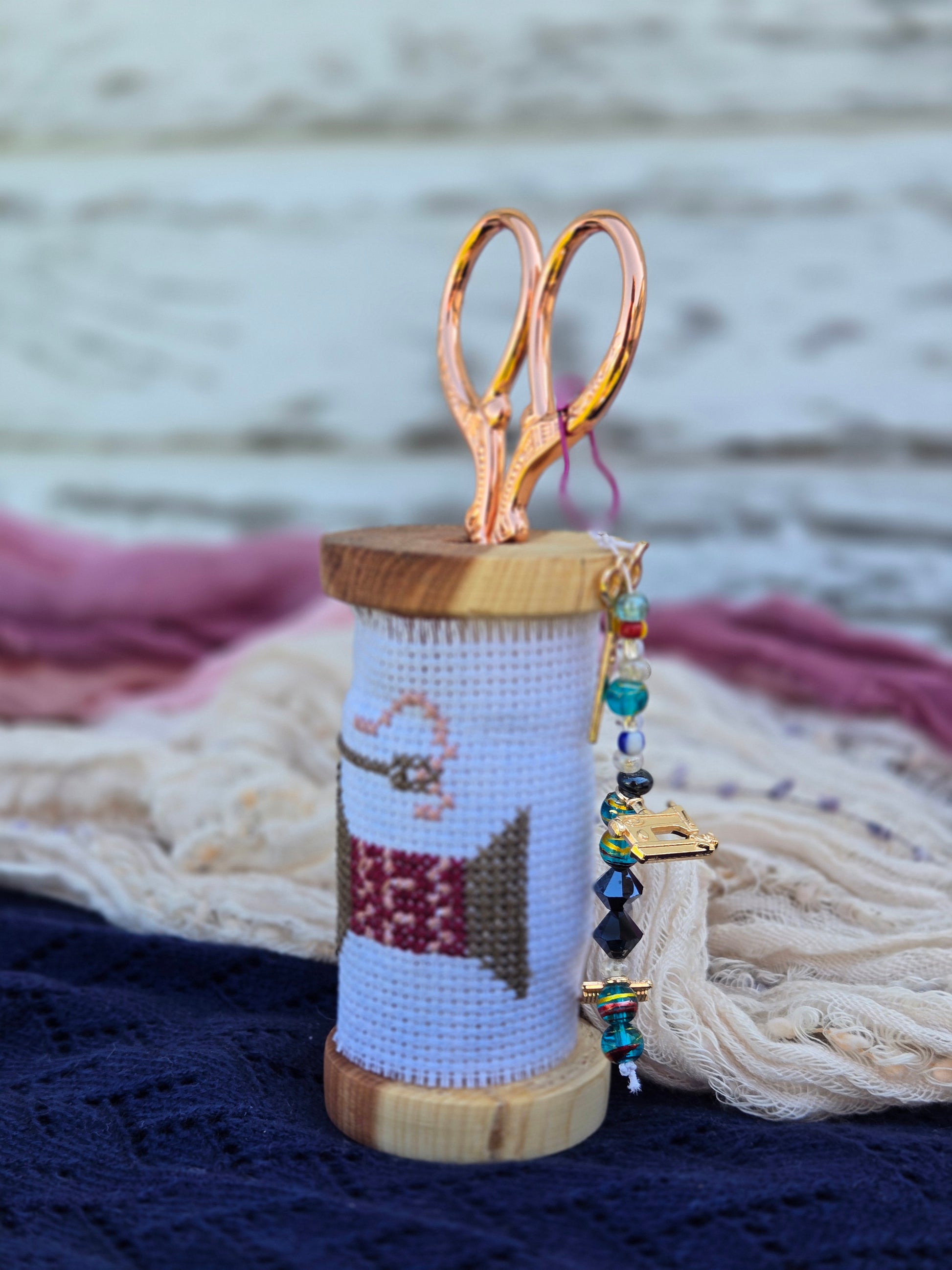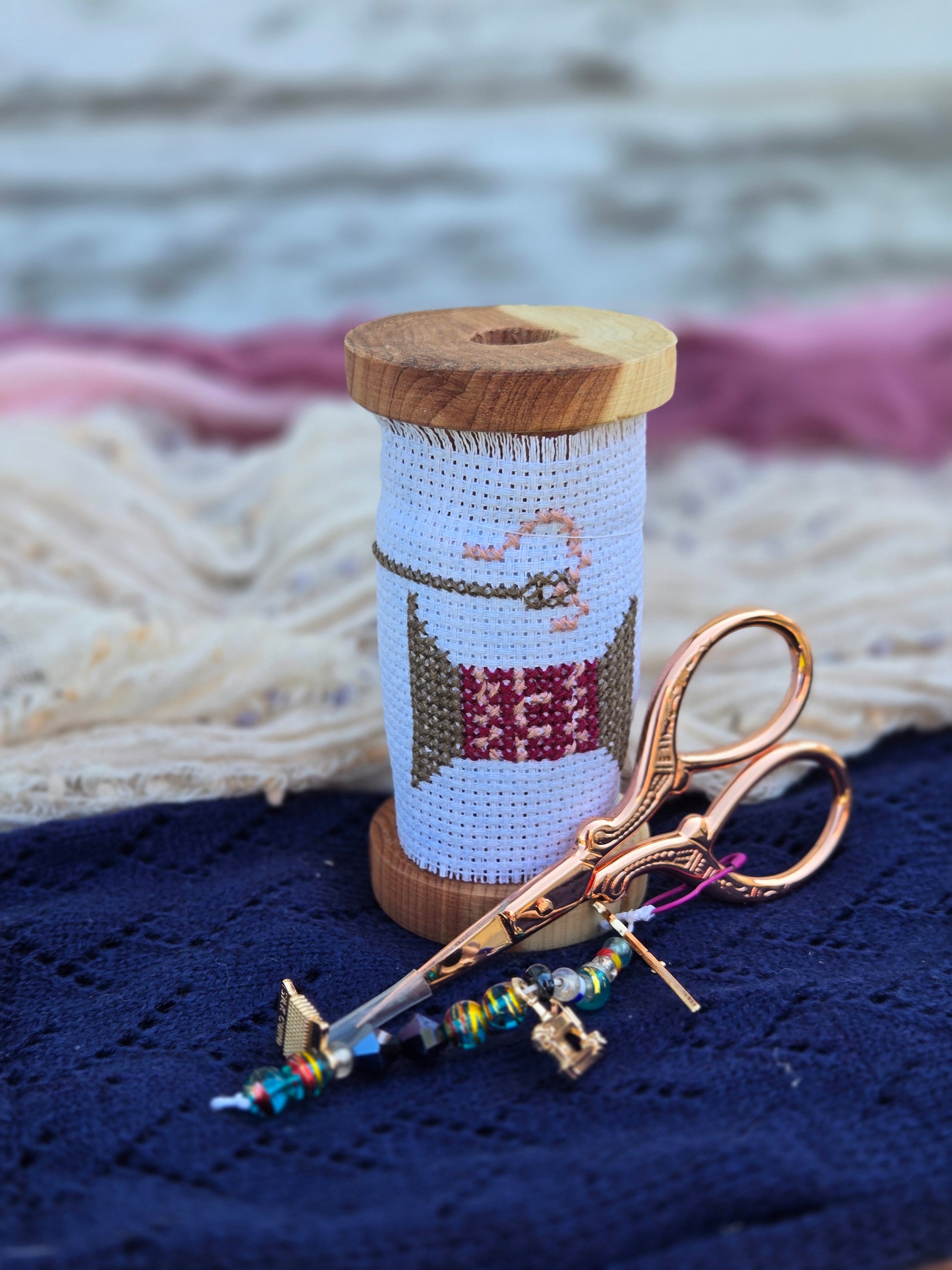 Keep your embroidery scissors neat and your crafting space charming with this mini wooden scissor stand. Hand-turned from natural wood and wrapped in a hand-stitched “spool of thread” cross-stitch design, this piece combines practical storage with delightful handmade artistry.