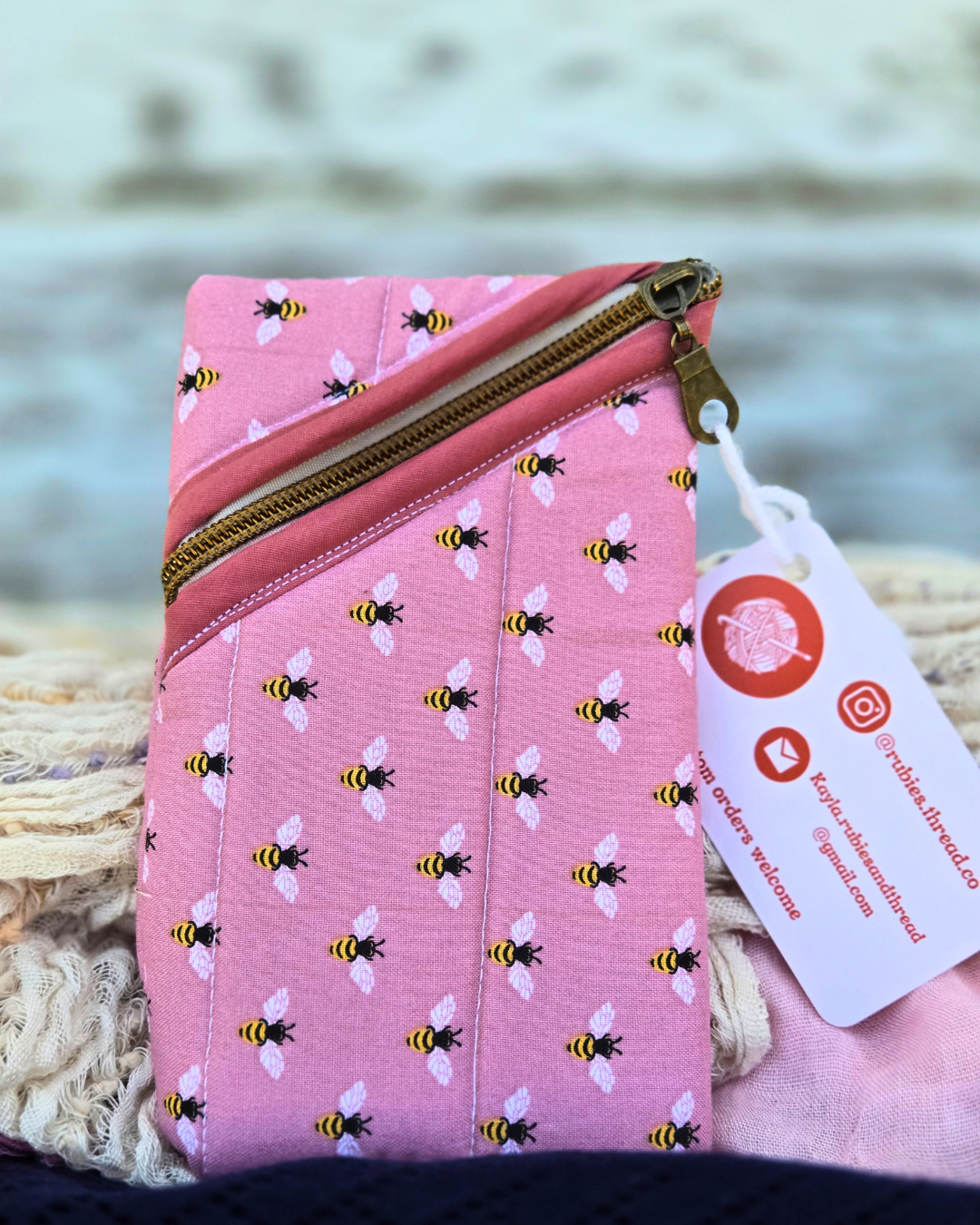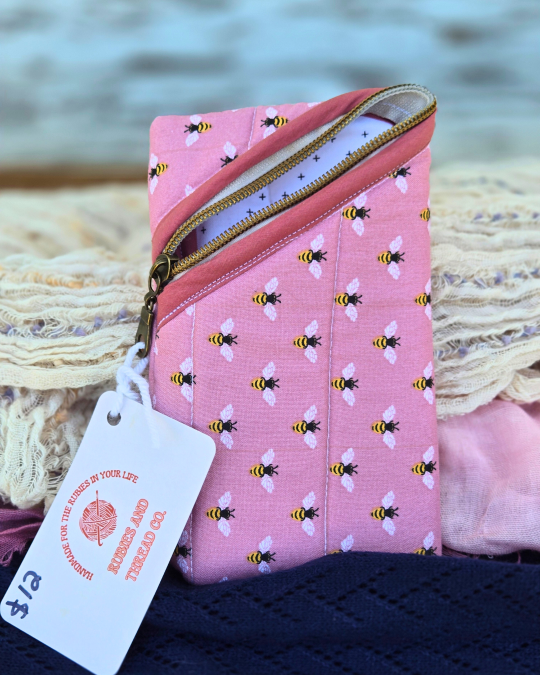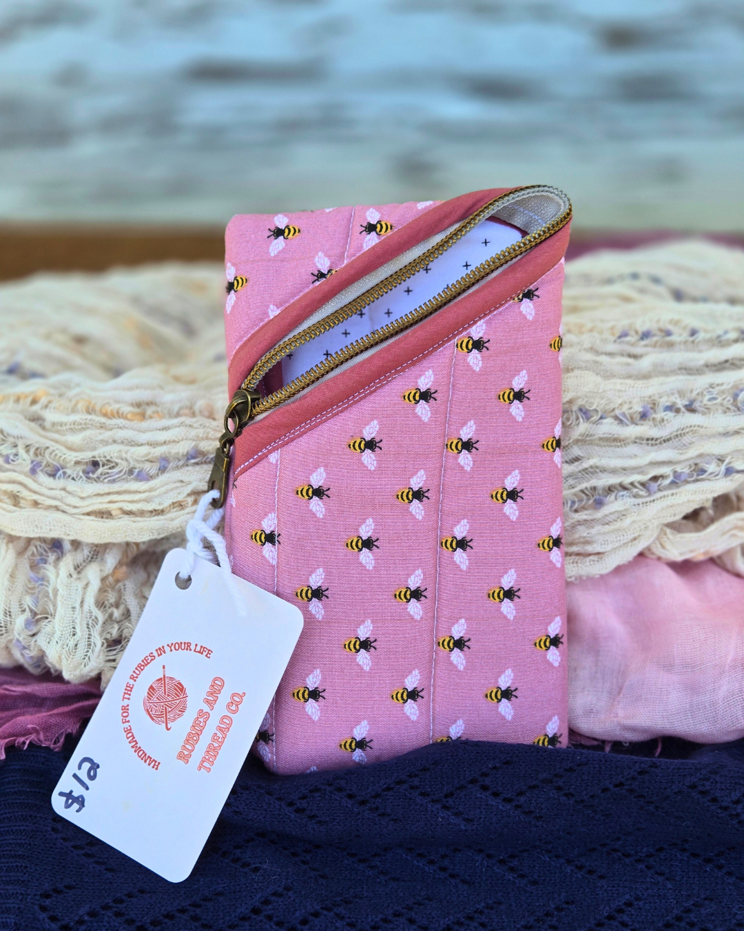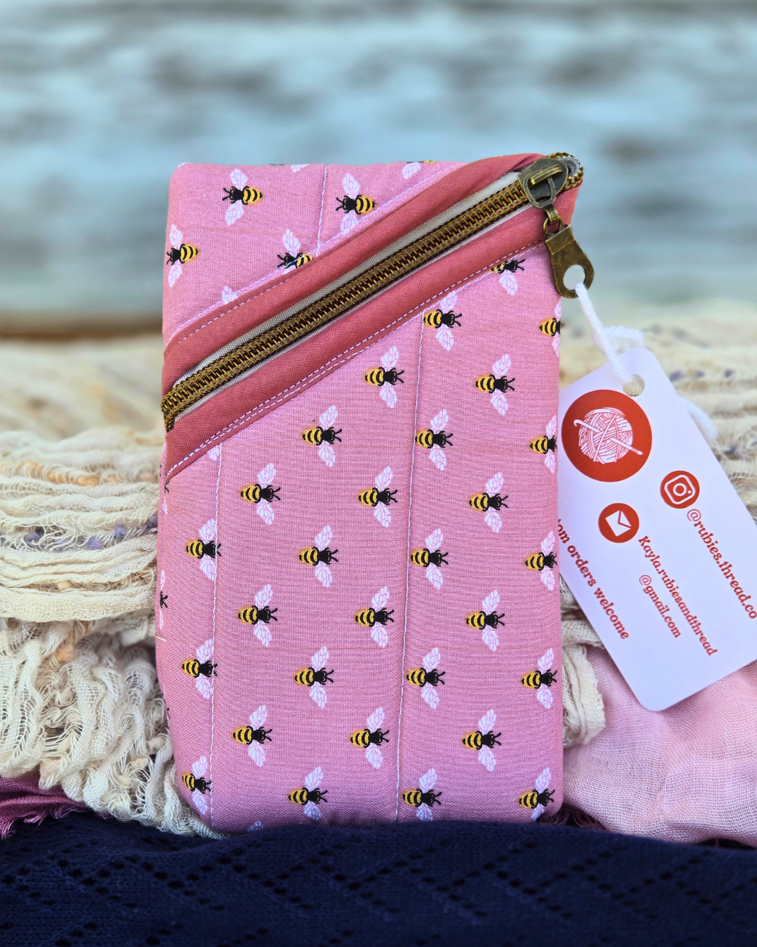 Keep your phone safe in the sweetest way possible! This handmade padded phone case features a cheerful pink fabric covered in buzzing bees, paired with a sturdy brass zipper for secure closure. The soft quilted padding adds extra protection against bumps and scratches, while the slim design makes it easy to slip into your bag or carry on its own.