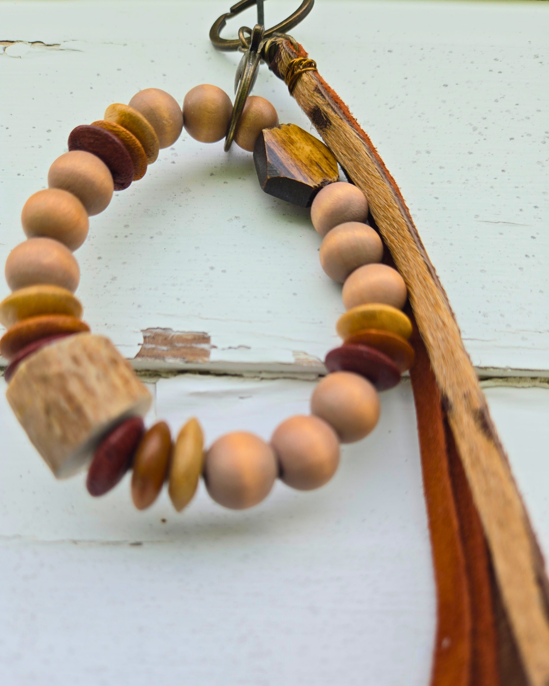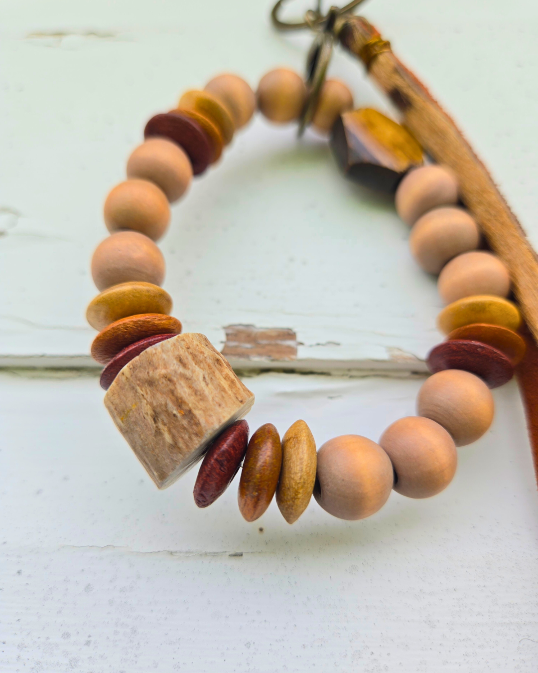 Earthy, elegant, and built for adventure — this one-of-a-kind wristlet combines natural textures for a rugged yet refined accessory. Hand-strung with smooth, unfinished wooden beads, the focal point is a rustic, cylindrical bone bead that adds bold texture and a story of its own. Rich-toned wood spacers bring warmth, while the handmade tassel features a mix of supple leather and cowhide for a natural finish that feels right at home on the prairie or in the palm of your hand.