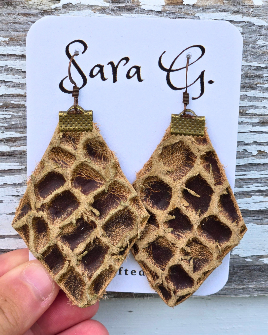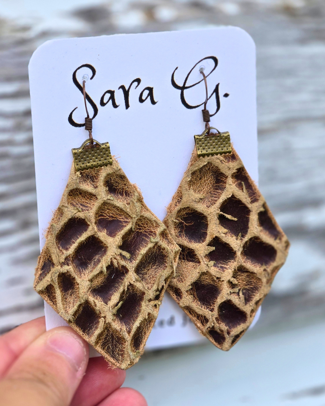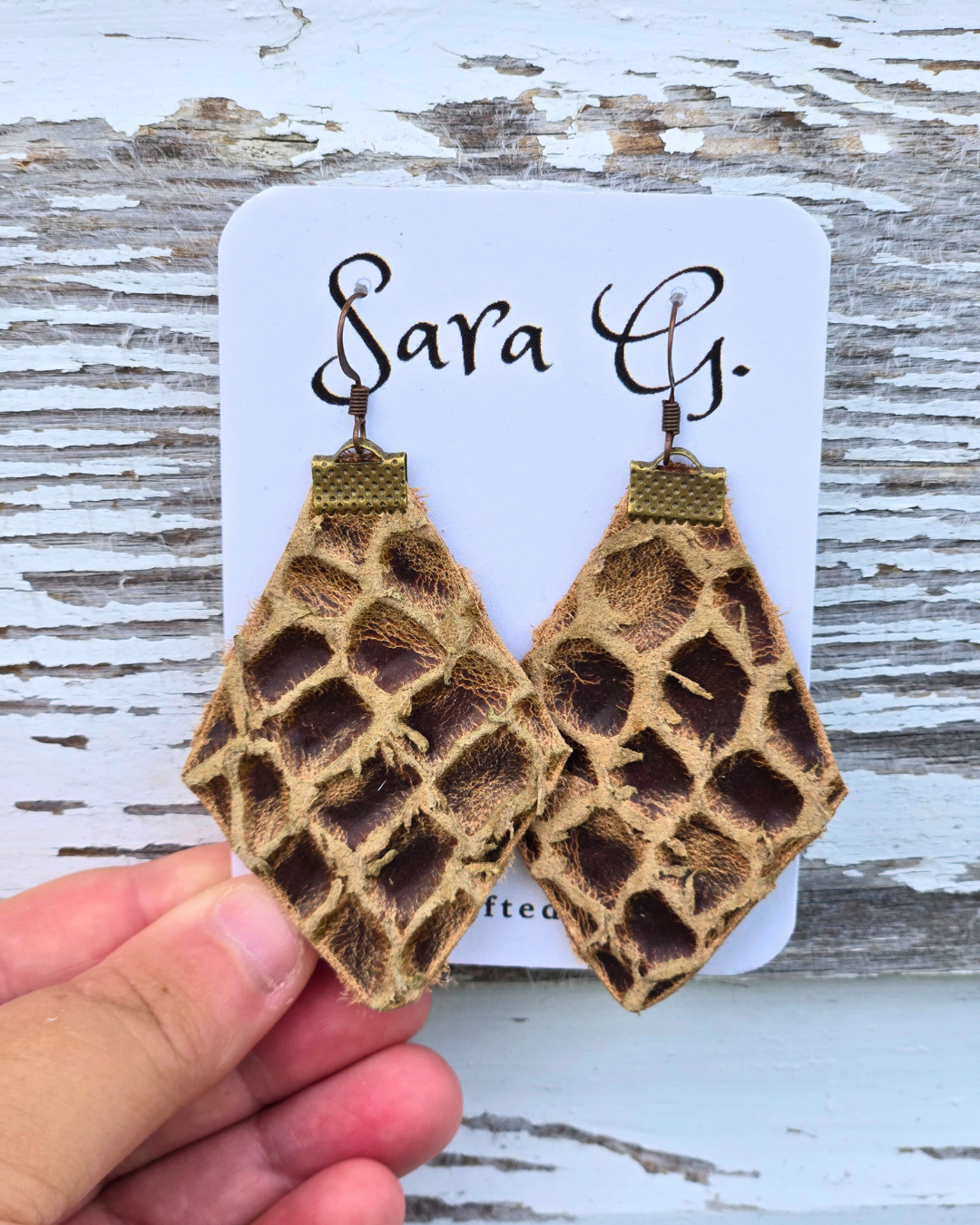 Make a bold statement with these stunning handcrafted earrings featuring richly textured, embossed cowhide leather. The deep, earthy tones of the hide are paired with rugged golden-brown undertones that give the piece a natural, worn-in character—perfect for lovers of rustic or Western-inspired style.