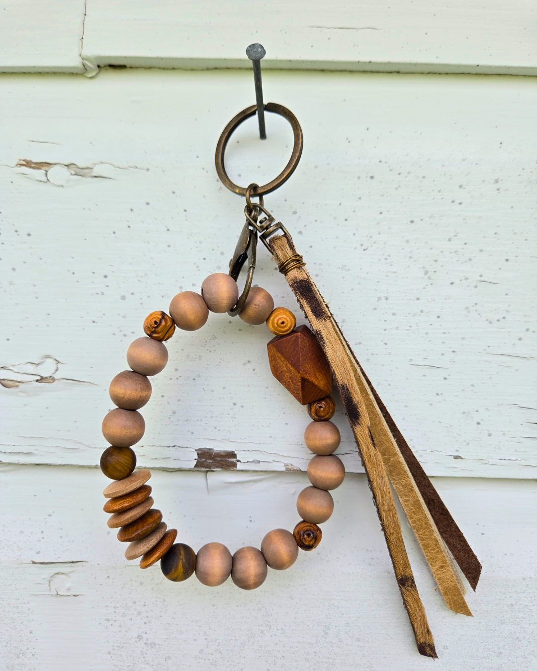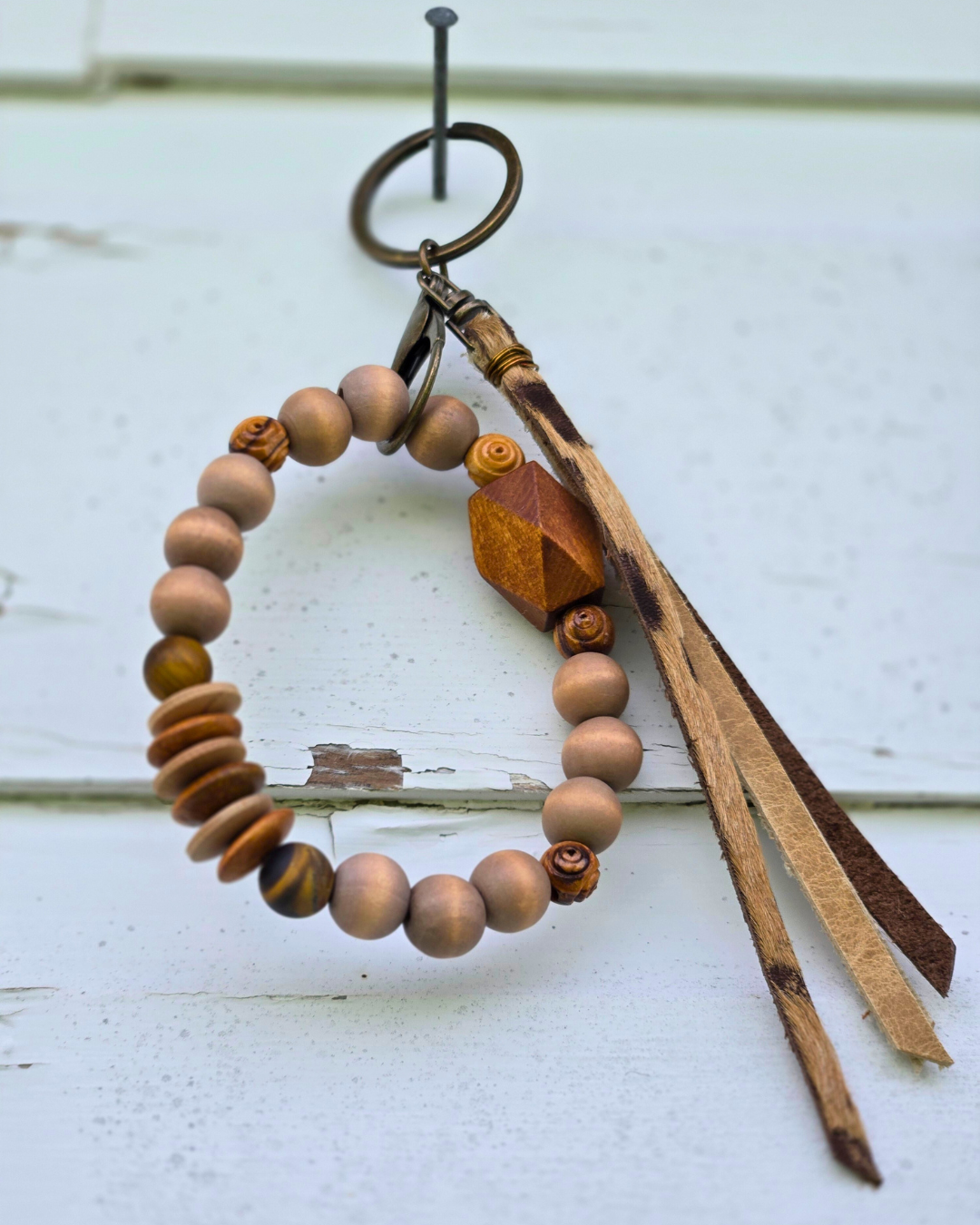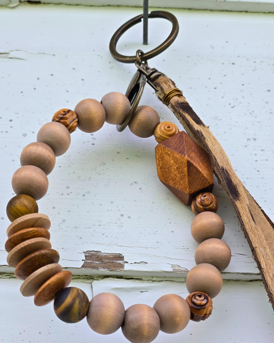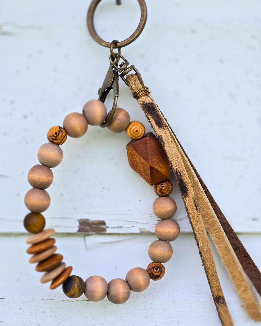 This handcrafted wristlet keychain features smooth, earthy-toned wooden beads accented with a unique geometric focal bead and hand-carved wood spirals. The natural palette is grounded by rich leather and striking cowhide tassels for a bold, rustic finish.